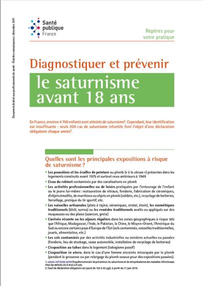 Ce dépliant de la collection "Repères pour votre pratique" à destination des professionnels de santé est une synthèse des connaissances récentes sur le saturnisme infantile : principales expositions à risque, effets du plomb sur la santé, quand prescrire une plombémie, comment prévenir le saturnisme. État des connaissances : janvier 2017