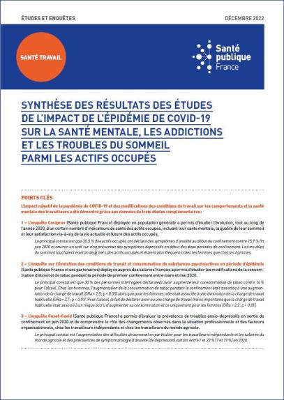 L'impact négatif de la pandémie de COVID-19 et des modifications des conditions de travail sur les comportements et la santé mentale des travailleurs a été démontré grâce aux données de trois études complémentaires : 1 - L'enquête Coviprev (Santé publique France) déployée en population générale a permis d'étudier l'évolution, tout au long de l'année 2020, d'un certain nombre d'indicateurs de santé des actifs occupés, incluant leur santé mentale, la qualité de leur sommeil et leur satisfaction vis-à-vis de la vie actuelle et future des actifs occupés. Le principal constat est que 30,5 % des actifs occupés ont déclaré des symptômes d'anxiété au début du confinement contre 15,9 % fin juin 2020 et environ un actif sur cinq présentait des symptômes dépressifs en début des deux périodes de confinement. Les troubles du sommeil touchaient environ deux tiers des actifs occupés et étaient plus fréquents chez les femmes que chez les hommes. 2 - L'enquête sur l'évolution des conditions de travail et consommation de substances psychoactives en période d'épidémie (Santé publique France et ses partenaires) déployée auprès des salariés français a permis d'étudier les modifications de la consommation d'alcool et de tabac pendant la période de premier confinement entre mars et mai 2020. Le principal constat est que 30 % des personnes interrogées déclaraient avoir augmenté leur consommation de tabac contre 14 % pour l'alcool. Chez les hommes, l'augmentation de la consommation de tabac pendant le confinement était associée à une augmentation de la charge de travail (ORa = 2,5 ; p < 0,05) alors que pour les femmes, elle était associée à une diminution de la charge de travail habituelle (ORa = 2,7 ; p < 0,01). Pour l'alcool, le fait de déclarer avoir eu une charge de travail moins importante que la charge de travail habituelle était associé à un risque accru d'augmenter sa consommation et ce uniquement pour les femmes (ORa = 2,2 ; p < 0,01). 3 - L'enquête Coset-Covid (Santé publique France) a permis d'évaluer la prévalence de troubles anxio-dépressifs en sortie de confinement en juin 2020 et de comprendre le rôle des changements observés dans la situation professionnelle et des facteurs organisationnels, chez les travailleurs indépendants et chez les travailleurs du monde agricole. Le principal constat est l'augmentation des difficultés de sommeil en particulier pour les travailleurs indépendants et les salariés du monde agricole et des prévalences de symptomatologie d'anxiété (de dépression) variant entre 7 et 22 % (7 et 19 %) en 2020.