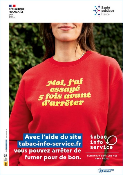 Cette affiche vise à normaliser les tentatives d’arrêt du tabac comme une étape du sevrage. En effet, chaque tentative est un pas vers l’arrêt définitif. Elle promeut également l’application Tabac...