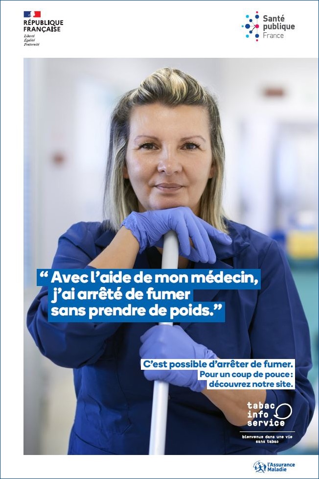 Affiche incitant à arrêter de fumer et faisant la promotion des aides à l'arrêt de Tabac info service, pour les lieux de santé.