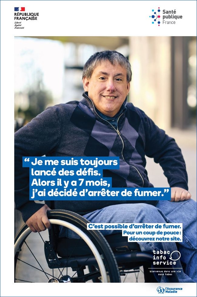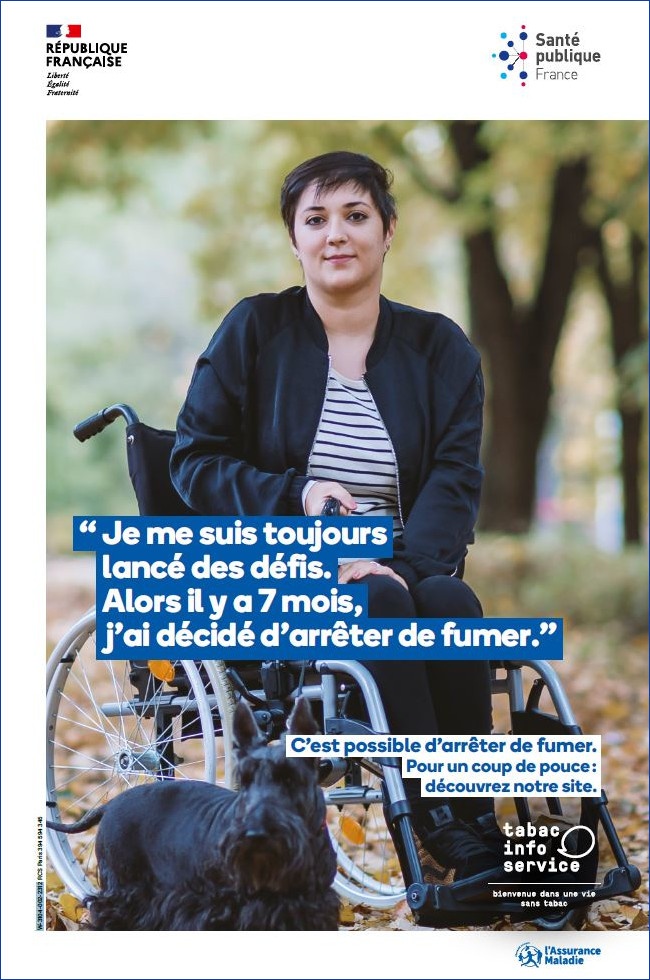 Affiche incitant à arrêter de fumer et faisant la promotion des aides à l'arrêt de Tabac info service auprès des personnes en situation de handicap.