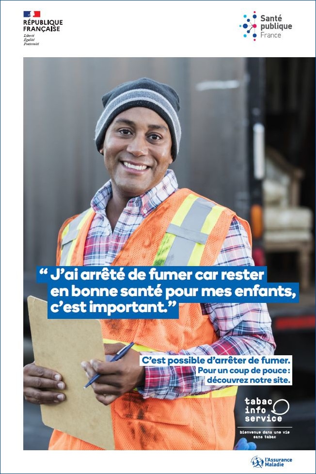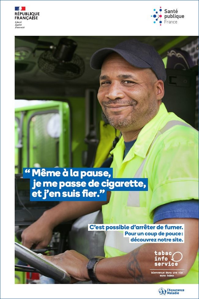Affiche incitant à arrêter de fumer et faisant la promotion des aides à l'arrêt de Tabac info service, en milieu professionnel de l'industrie et de la production.