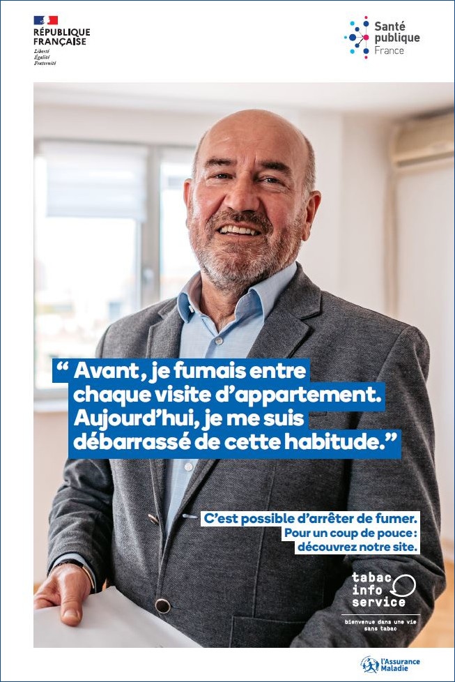 Affiche incitant à arrêter de fumer et faisant la promotion des aides à l'arrêt de Tabac info service, en milieu professionnel de l'immobilier.