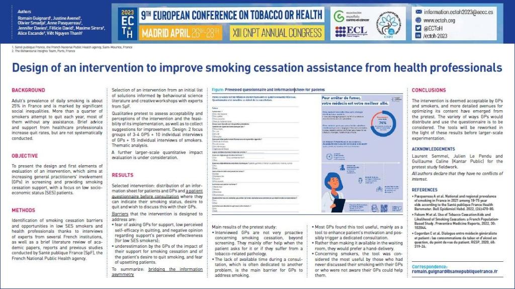 Background: Adult's prevalence of daily smoking is about 25% in France and is marked by significant social inequalities. More than a quarter of smokers attempt to quit each year, most of them doing it without any assistance. Brief advice and support from health care professionals increase quit rates, but are not systematically carried out. We present the design and first elements of evaluation of an intervention aimed at increasing the involvement of general practitioners (GPs) in screening and providing smoking cessation support, with a focus on low socioeconomic status (SES) patients.Methods: Smoking cessation barriers and opportunities in low SES smokers and health professionals were identified thanks to interviews of experts from several French institutions, as well as a brief literature review of academic papers, reports and previous studies conducted by Santé publique France (SpF). From an initial list of solutions, an intervention was selected and co-creation workshops with experts from SpF were set up. A qualitative pretest is underway to assess acceptability and perceptions of the intervention by smokers and GPs and the feasibility of its implementation, as well as to collect suggestions for improvement before further larger-scale evaluation.Results: The selected intervention consists of the distribution of an information sheet for patients and GPs and a patient questionnaire before consultation where they can indicate their smoking status, desire to quit and wish to discuss this with their GPs. The barriers that the intervention is designed to address are: 1) fear of asking GPs for support, low perceived self-efficacy in quitting, and negative opinion regarding support's perceived effectiveness (for low SES smokers); 2) underestimation of the impact of support for smoking cessation and of the patient's desire to quit smoking, and fear of upsetting patients (for GPs). Main conclusions: Results of the qualitative pretest will be shared during the conference.