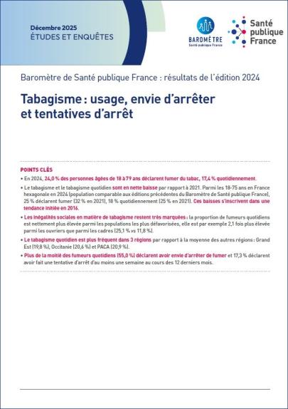 En 2024, 24,0 % des personnes âgées de 18 à 79 ans déclarent fumer du tabac, 17,4 % quotidiennement. Le tabagisme et le tabagisme quotidien sont en nette baisse par rapport à 2021. Parmi les 18-75 ans en France hexagonale en 2024 (population comparable aux éditions précédentes du Baromètre de Santé publique France),25 % déclarent fumer (32 % en 2021), 18 % quotidiennement (25 % en 2021). Ces baisses s'inscrivent dans une tendance initiée en 2016. Les inégalités sociales en matière de tabagisme restent très marquées : la proportion de fumeurs quotidiens est nettement plus élevée parmi les populations les plus défavorisées, elle est par exemple 2,1 fois plus élevée parmi les ouvriers que parmi les cadres (25,1 % vs 11,8 %). Le tabagisme quotidien est plus fréquent dans 3 régions par rapport à la moyenne des autres régions : Grand Est (19,8 %), Occitanie (20,6 %) et PACA (20,9 %). Plus de la moitié des fumeurs quotidiens (55,0 %) déclarent avoir envie d'arrêter de fumer et 17,3 % déclarent avoir fait une tentative d'arrêt d'au moins une semaine au cours des 12 derniers mois.