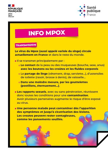 Tract recto-verso qui informe sur la circulation actuelle en France et dans le monde du virus Mpox : mode de transmission, symptômes, conduite à tenir en cas d'infection. Il invite à consulter le...