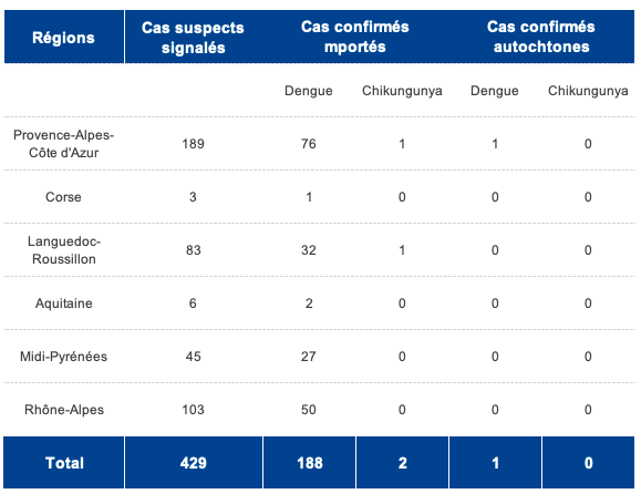 Le risque de survenue d’autres cas autochtones a été estimé comme minime, en raison de la faible implantation du moustique Aedes albopictus (moustique tigre) dans la zone et de l’arrivée de la période hivernale. A ce jour, les investigations, n’ont pas permis d’identifier la source précise de cette contamination.