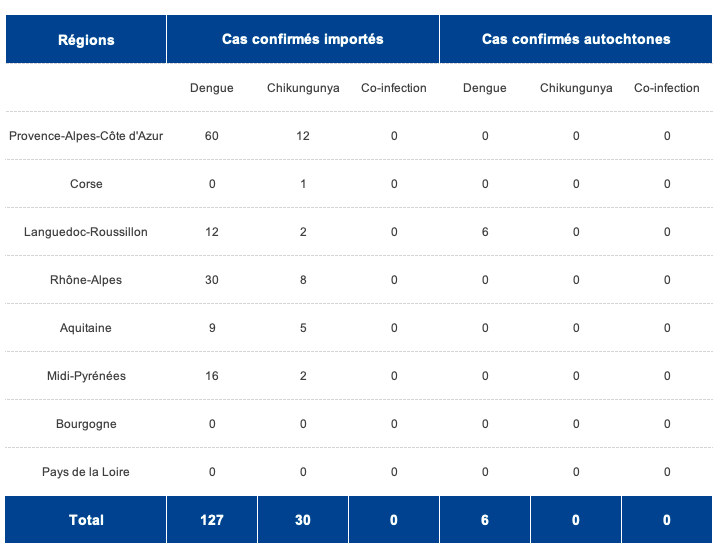 • 4 cas autochtones de dengue ont été confirmés par le Centre National de Référence (CNR) des arbovirus en région Provence-Alpes-Côte d’Azur. Les 2 premiers, confirmés les 20 août et 11 septembre sont survenus dans le département du Var. Ils ne sont pas liés car de sérotype différents (sérotype 1 et sérotype 2). Les 3ème et 4ème cas, confirmés les 18 septembre et 3 octobre dans le département des Bouches du Rhône sont liés et constituent un foyer. Les 2 patients résident dans le même voisinage et ont le même sérotype de dengue : sérotype 2. Ils ne sont pas liés aux cas du Var.